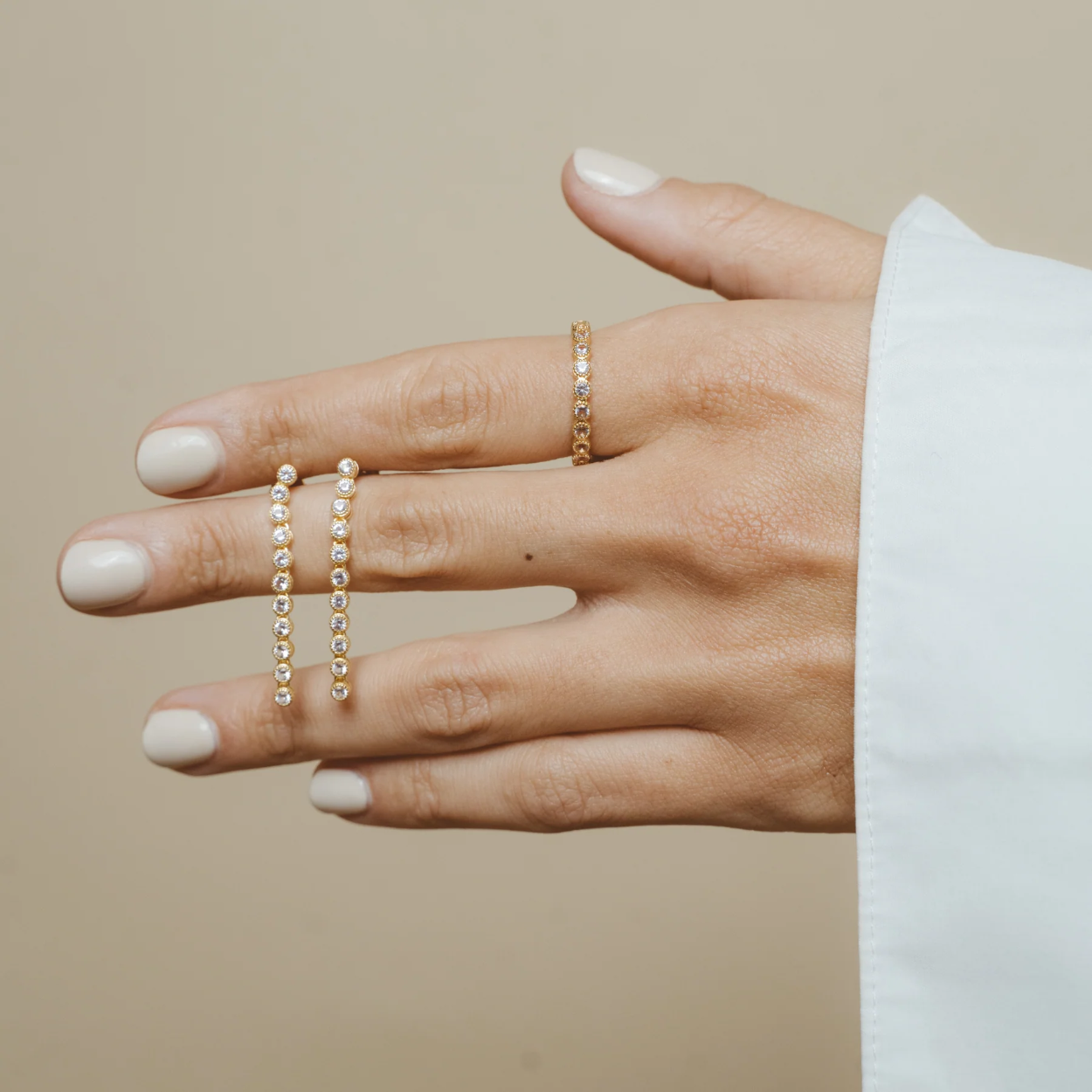 Deze ring is voorzien van lichtroze ronde steentjes. Perfect te combineren met de bijbehorende armband en oorbellen. Dit sieraad is geschikt voor elke gelegenheid! Alle sieraden van 24Kae zijn met liefde en oog voor detail ontworpen door Kae Sutherland. Elke 24Kae armband heeft het authentieke kenmerk van een handgemaakte bedel met gravure. Details: - Breedte band: 2.5 mm - Dikte band: 1.7 mm Materialen: - 925 Sterling zilver, voorzien van een 14k gouden laagje - Cubic zirkonia steentjes