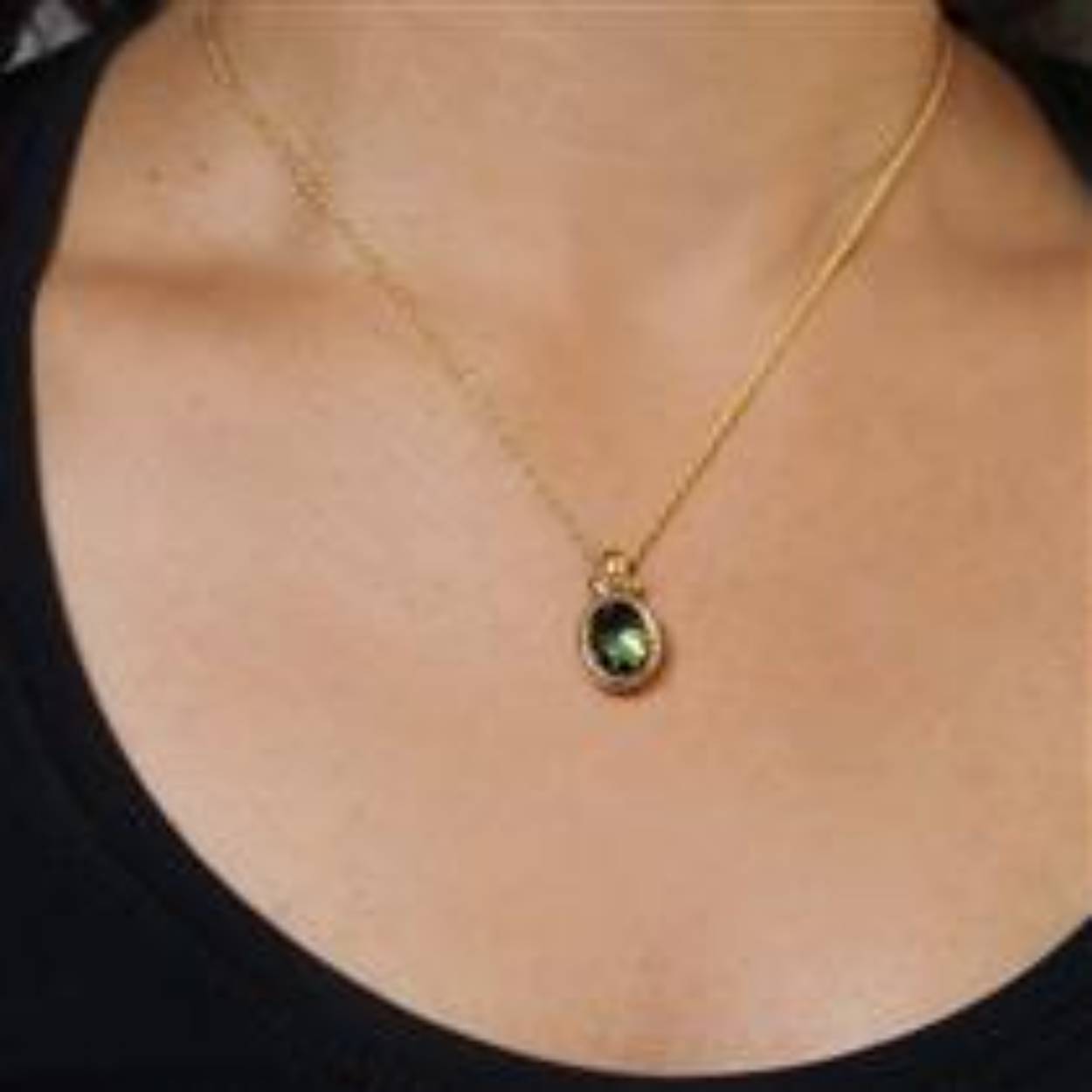 Deze geel goud vergulde ketting kan zowel op 42 als op 45 cm gedragen worden. De hanger bevat een groene kwarts steen van 10 x 8 mm.
