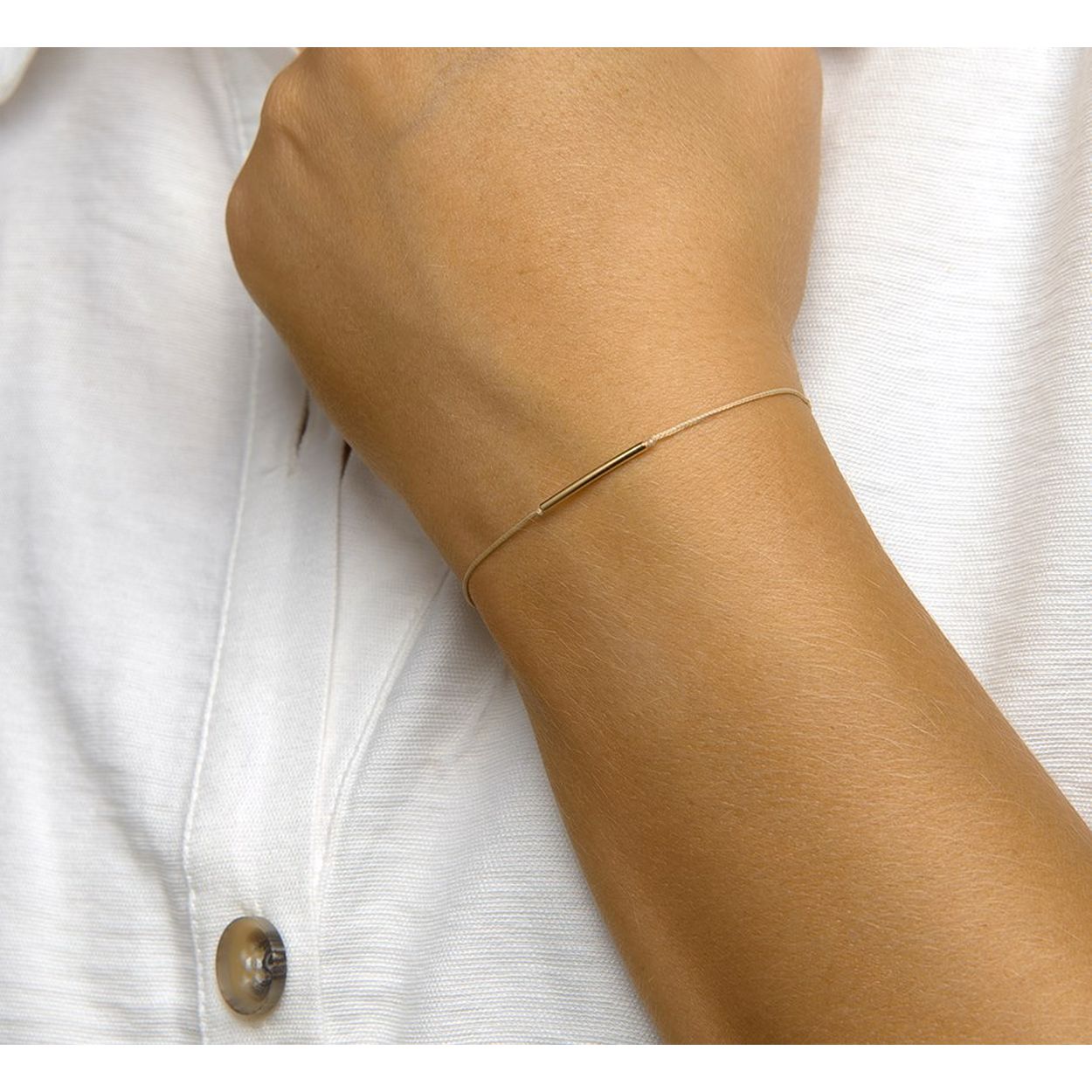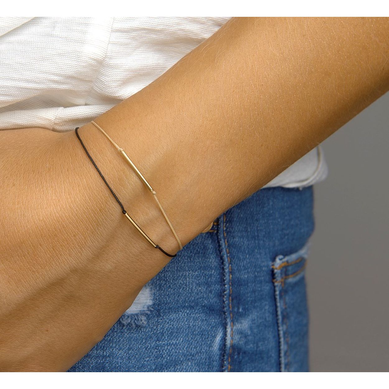 Bruin gevlochten armband uitgevoerd met een 14k geelgouden element. De armband heeft draaglengtes van 13 tot 19cm. Het element heeft een afmeting van 1.5x18.5mm.