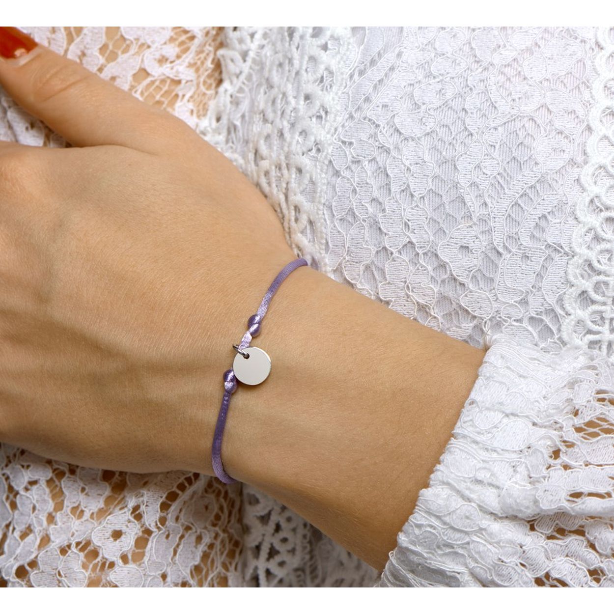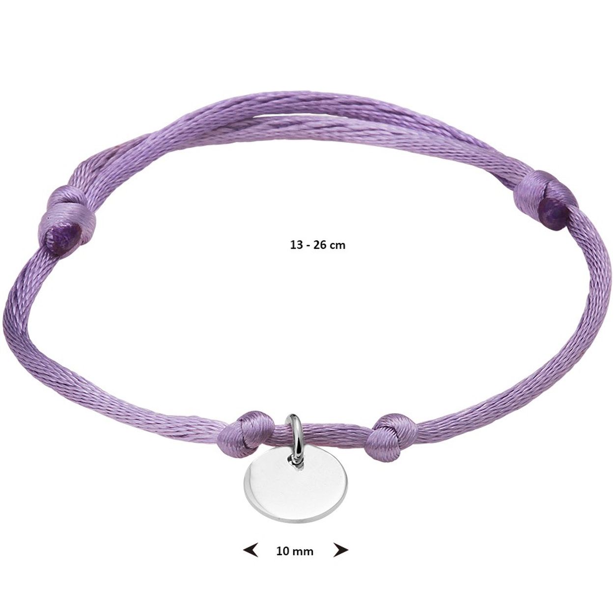 Lavendel kleur gevlochten armband uitgevoerd met een gerhodineerd 925 zilveren rondje. De armband heeft draaglengtes van 13 tot 26cm. Het rondje heeft een diameter van 10mm.