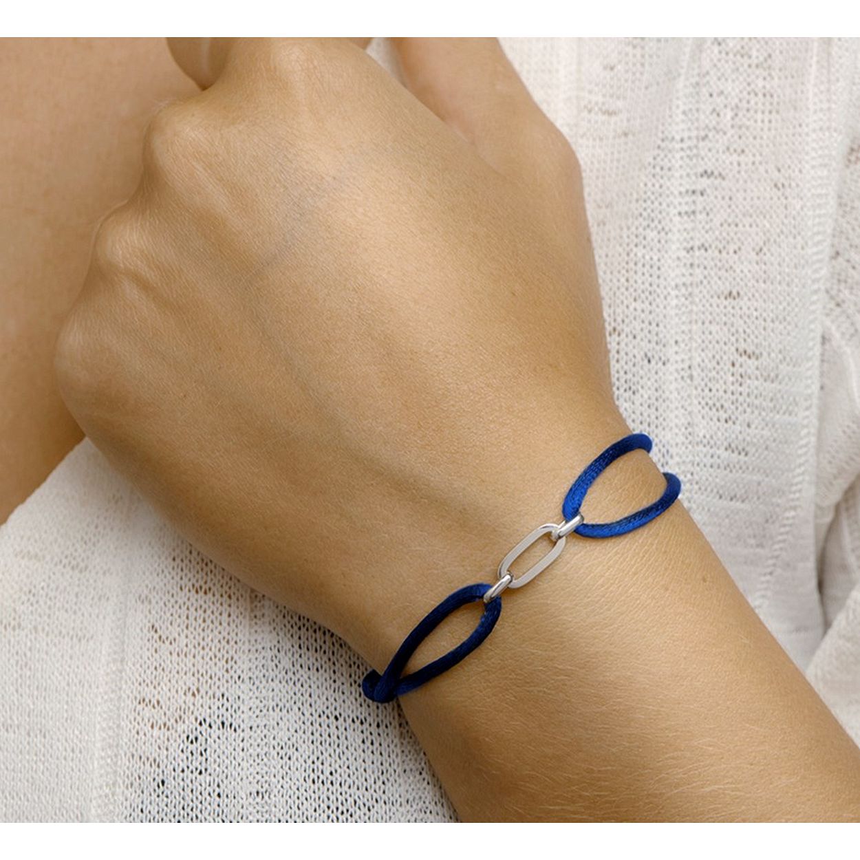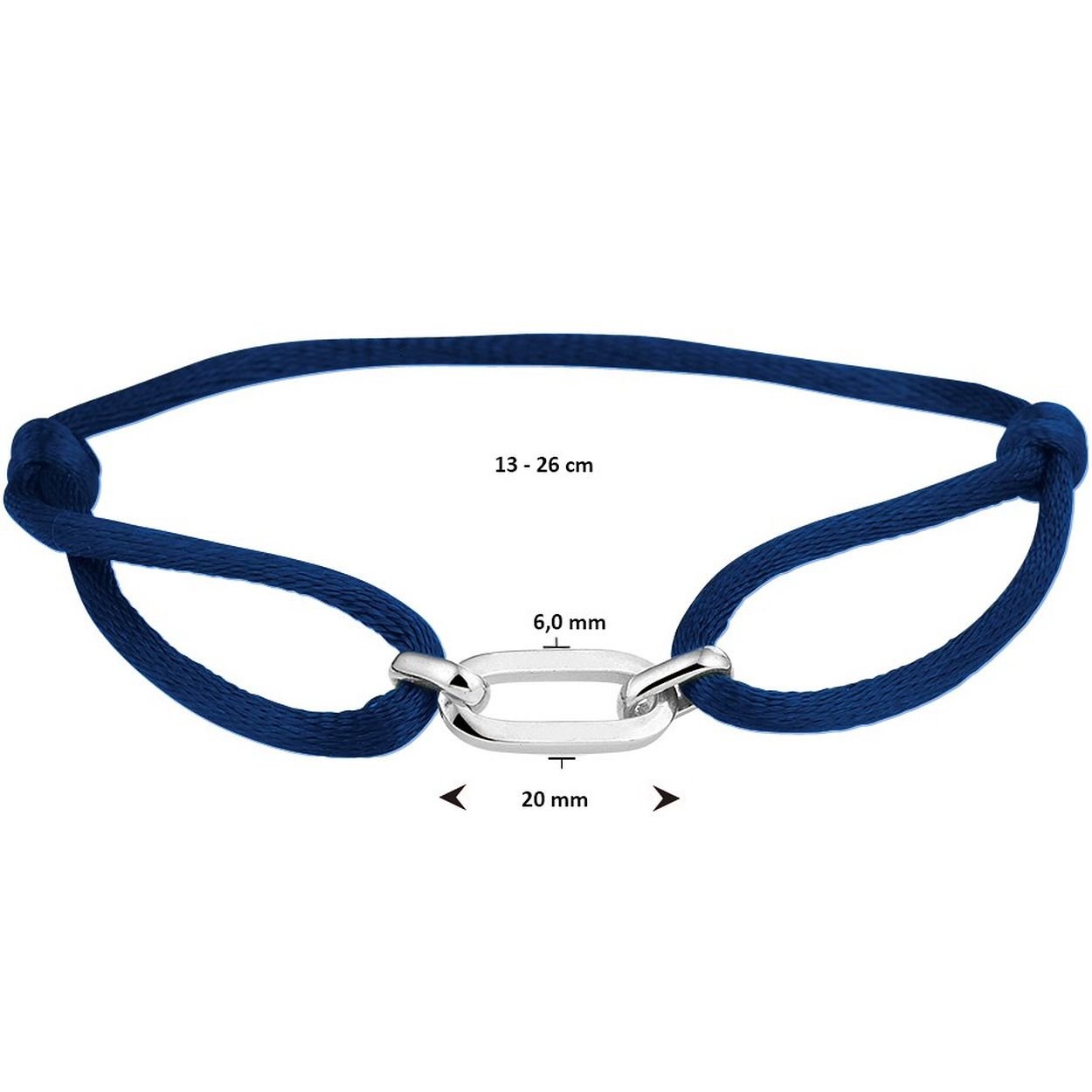Donkerblauw gevlochten armband uitgevoerd met een gerhodineerd 925 zilveren element. De armband heeft draaglengtes van 13 tot 26cm. Het element heeft een afmeting van 20x6mm.