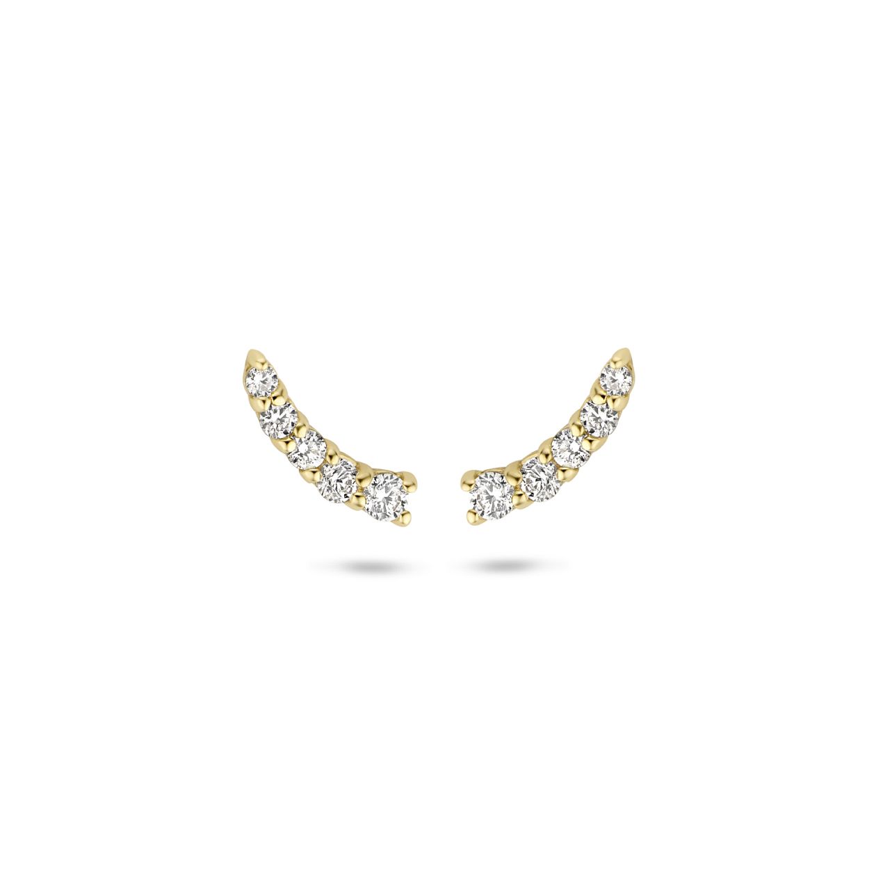 Subtiel en toch schitterend aanwezig zijn deze Blush oorbellen 7319YZI met 5 Zirkonia�s die  zijn geplaatst in 14 karaat maanvormig geelgoud. Dankzij het elegante design laten deze Blush oorstekers zich moeiteloos combineren met geelgouden Blush armbanden, ringen en colliers, met of zonder Zirkonia�s. De afmeting van de oorbellen is ? mm.