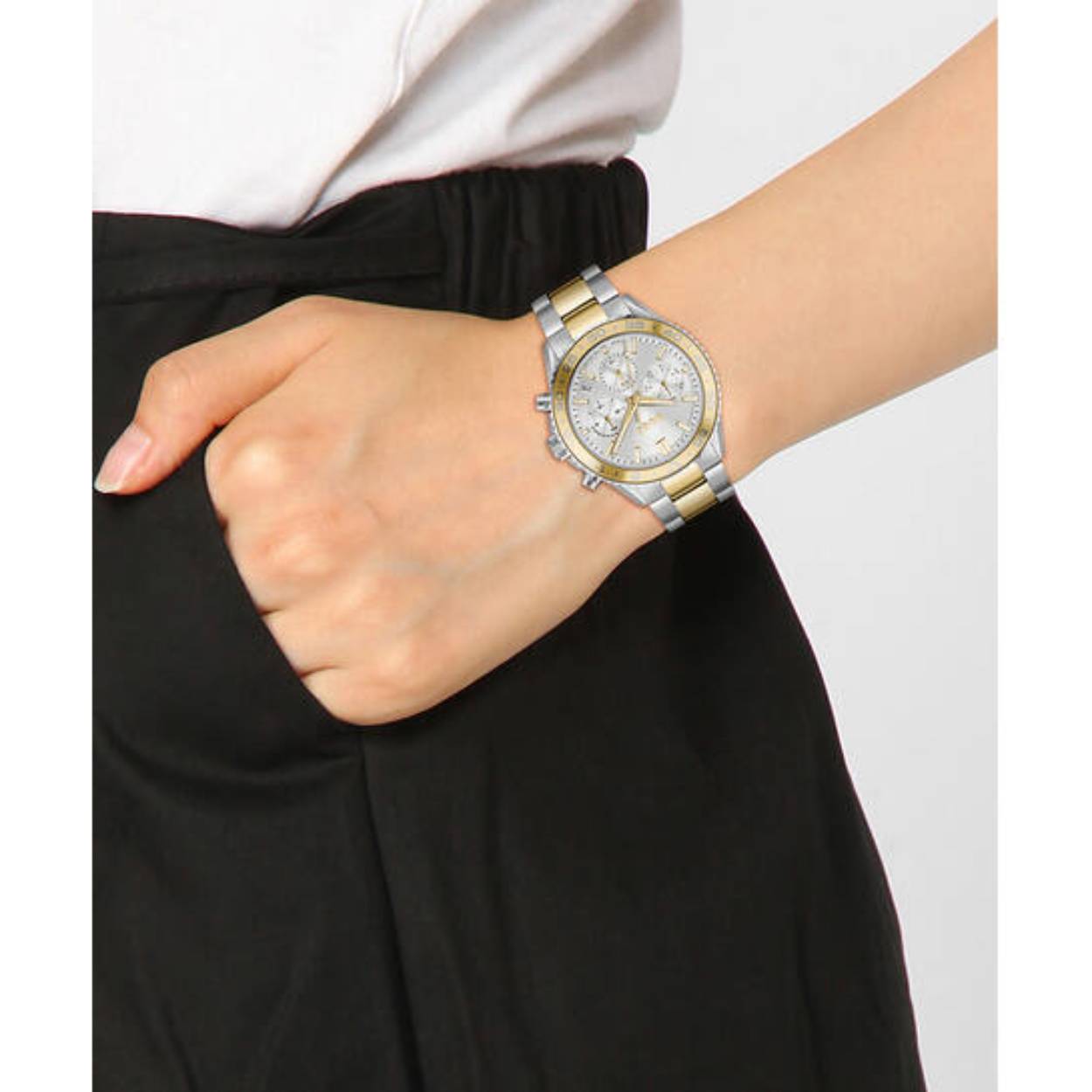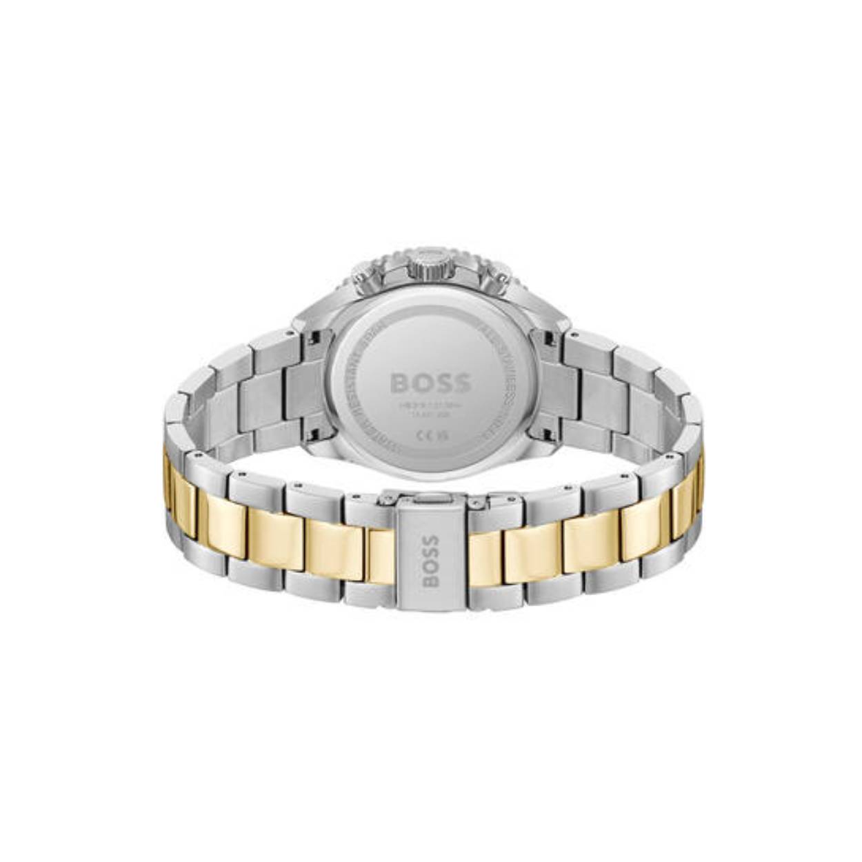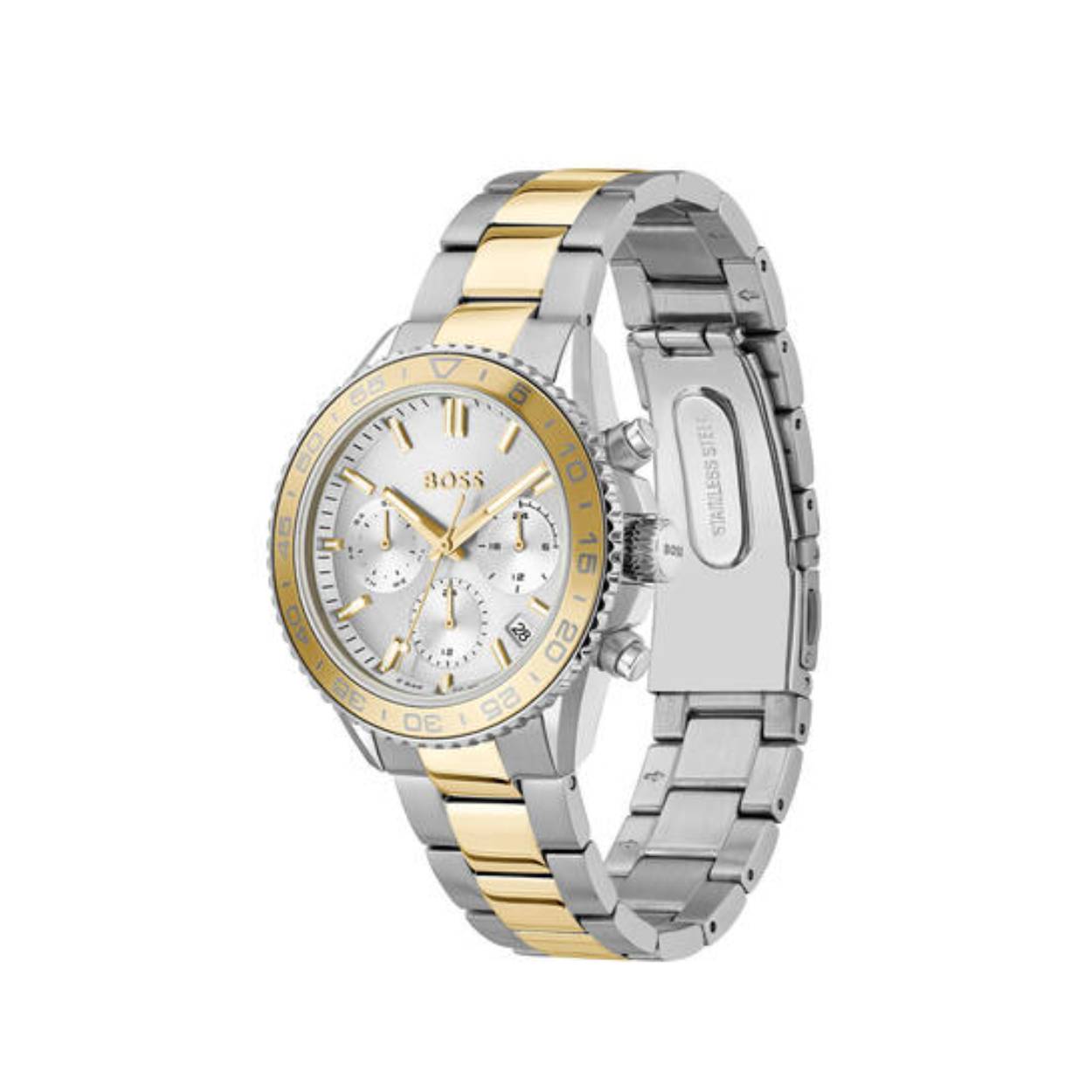 Dit BOSS horloge uit de RUNNER FOR HER serie met artikelnr: HB1502756 heeft een nette sportieve uitstraling. Zeer geschikt voor de moderne stijlvolle vrouw van nu. Het stalen multifunctionele dameshorloge valt op door zijn stalen horlogekast met een goudkleurige bewerkte bezel en een zilverwitte sunray wijzerplaat. Opvallend is de lumibrite op de wijzers en streepjes. Aan de kast zit een bicolor schakelband met vouwsluiting. De kast van het horloge heeft een doorsnee van 38mm met mineraalglas en is 5ATM.