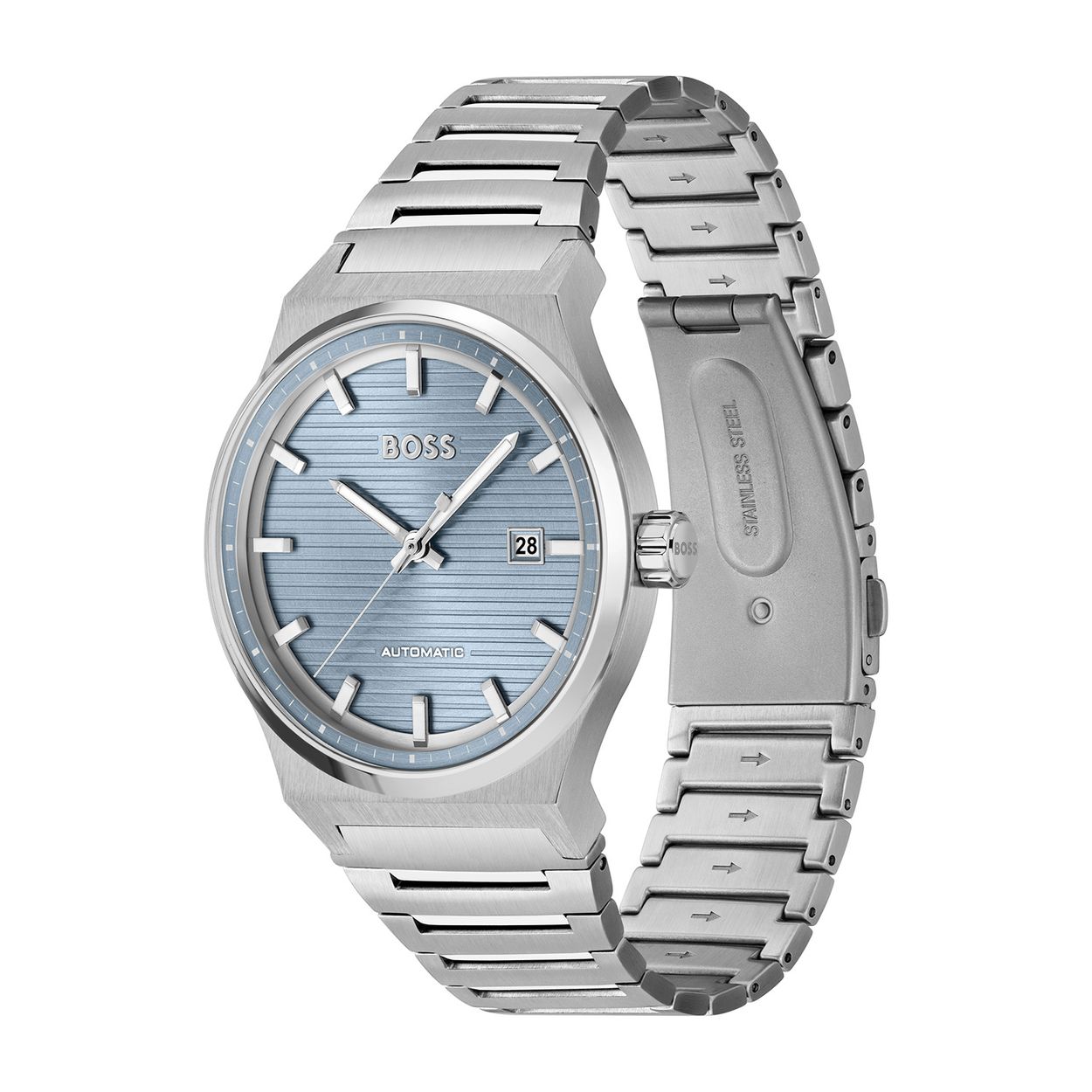 Dit BOSS horloge uit de CANDOR serie met artikelnr: HB1514118 heeft een luxe sportieve uitstraling. Zeer geschikt voor de moderne stijlvolle BOSS klant. Het horloge valt op door zijn zilverkleurige stalen horlogekast met een blauwe bezel en een blauwe bewerkte wijzerplaat met datum. Het horloge heeft een automatisch uurwerk dat via een venster in de achterdeksel zichtbaar is. De wijzers en uursaanduiding hebben een lumibrite laagje en geven dit horloge een chique uitstraling. Aan de kast zit een zilverkleurige stalen fijne schakelband met een vouwsluiting. De kast van het horloge heeft een doorsnee van 41mm met mineraalglas en is 5ATM.