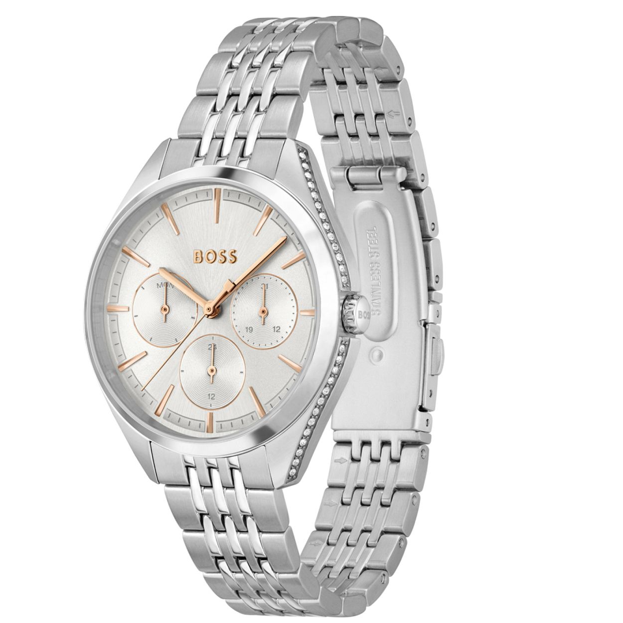 Dit BOSS dameshorloge uit de Saya serie met artikelnr. HB1502640 is een stijlvol horloge voor de moderne vrouw van nu. Het horloge heeft een zilverkleurige stalen horlogekast met een glimmende bezel en een zilverwitte wijzerplaat met een dag datum en 24-uursaanduiding. Het dameshorloge heeft een zilverkleurige stalen schakelband. Het BOSS Saya dameshorloge heeft een doorsnee van 38mm een mineraalglas en is 3 ATM.