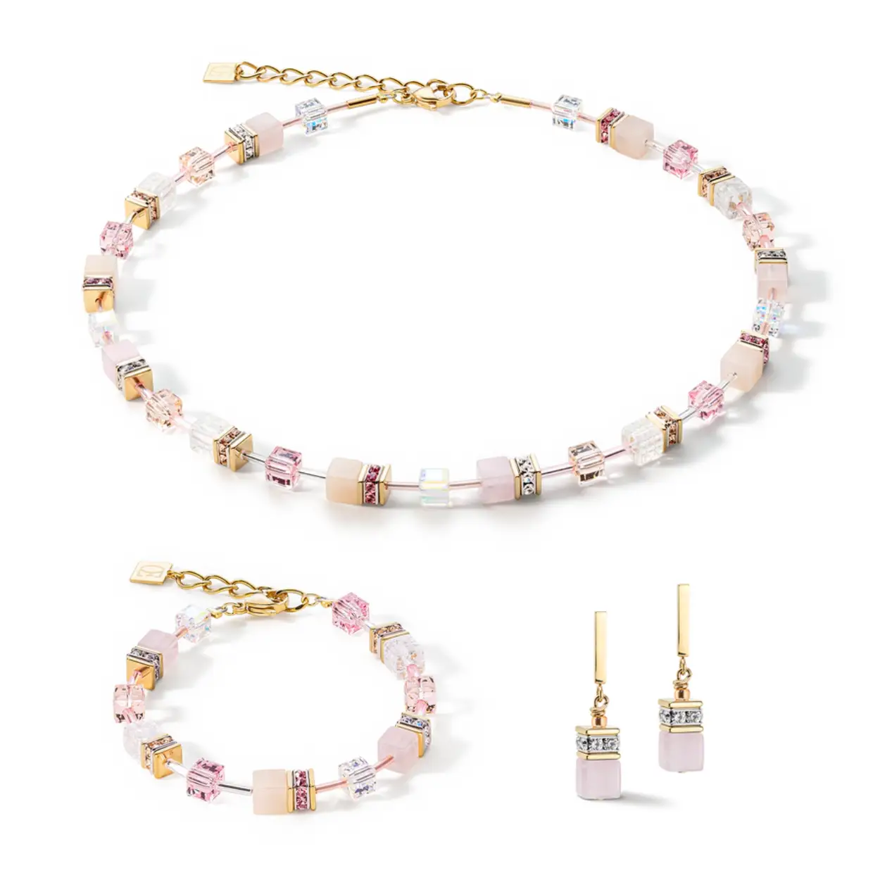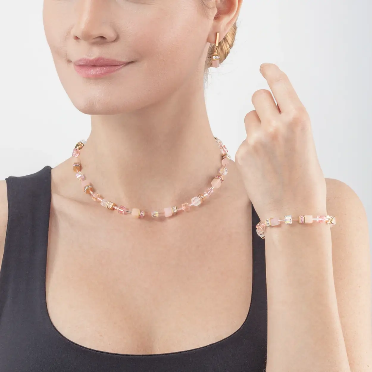 Liefdevol handgemaakt in Duitsland, deze elegante GeoCUBE® ketting in goud, met pastelkleurige edelstenen zoals roze aventurijn en sensuele rozenkwarts gecombineerd met bergkristal, Swarovski® kristallen, strass rondellen en roestvrij staal goudkleurig. Straal verfijning uit met de Iconic Precious in de kleur lichtroze van Coeur de Lion!
