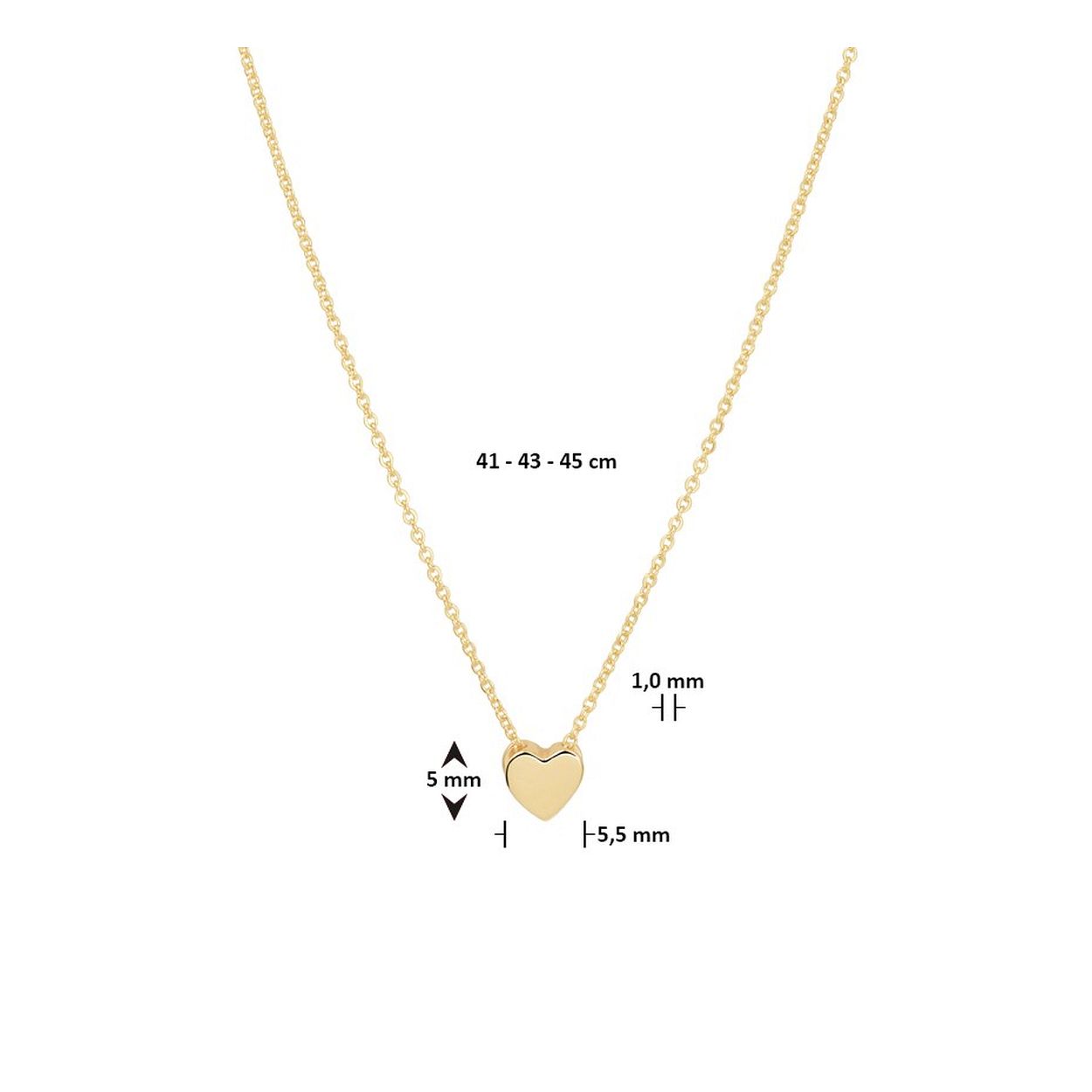 14k Geelgouden collier uitgevoerd met een hartje. Het collier heeft draaglengtes van 41, 43 en 45cm. Het hartje heeft een afmeting van 5x5.5mm.