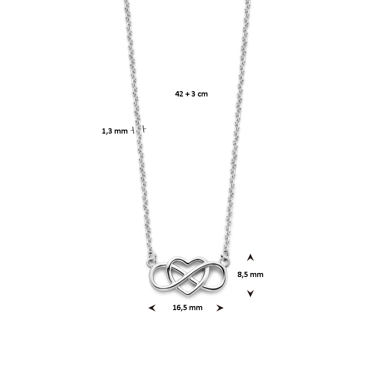 Gerhodineerd 925 zilveren collier uitgevoerd met zirkonia, hart en infinity. Het collier heeft een schakelbreedte van 1.3mm en is uitgevoerd met karabijnsluiting. De draaglengte is 42cm met een extensie van 3cm.