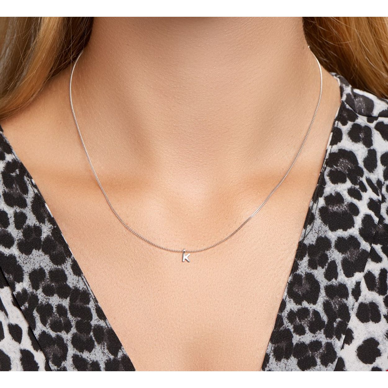 Gerhodineerd zilveren collier met de letter K. Het collier heeft een draaglengte van 41cm en een extensie van 5cm, uitgevoerd met een stevige karabijn sluiting. De hanger heeft een hoogte van 7.5mm en een breedte van 4mm. Tip: Geef dit persoonlijke collier cadeau aan een dierbare of geliefde.
