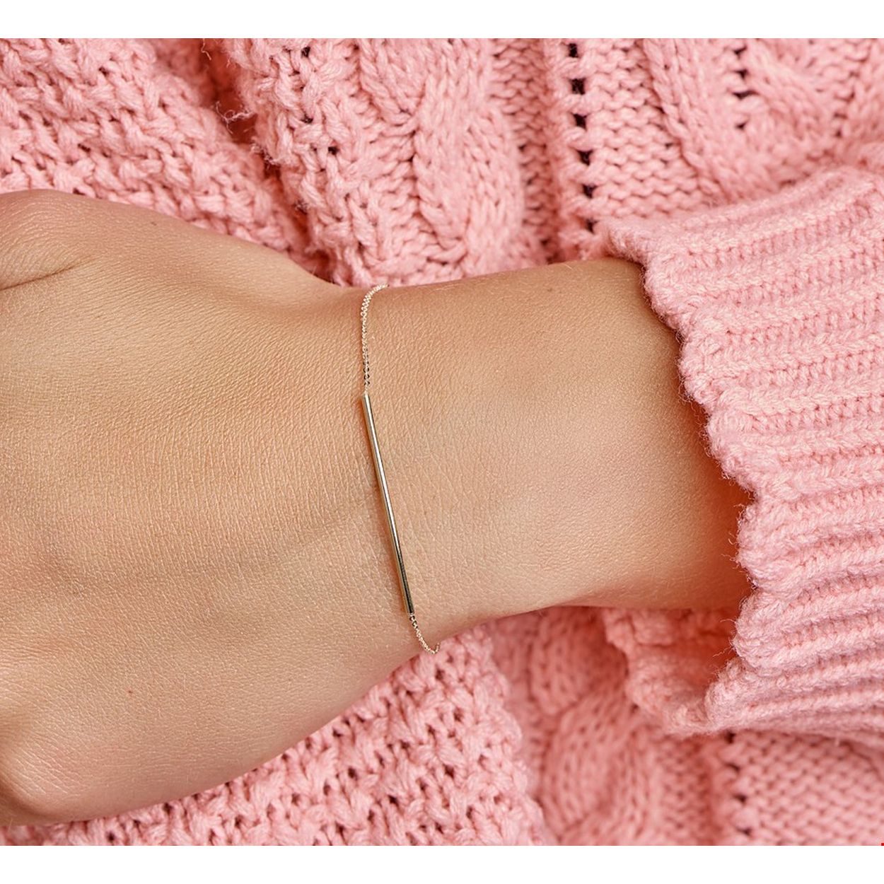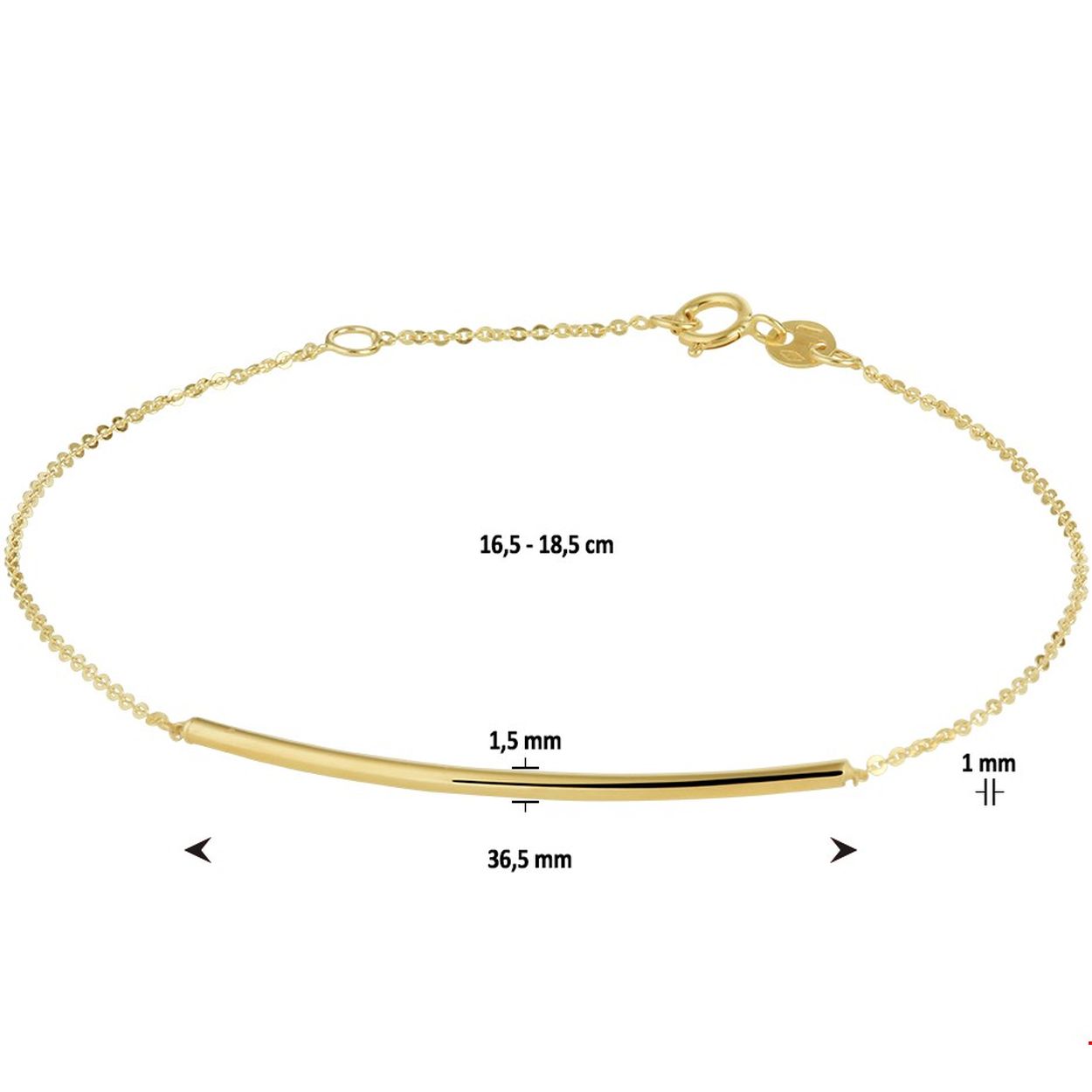 14k Geelgouden anker armband uitgevoerd met een poli afgewerkt balkje. De armband heeft draaglengtes van 16.5 en 18.5cm.