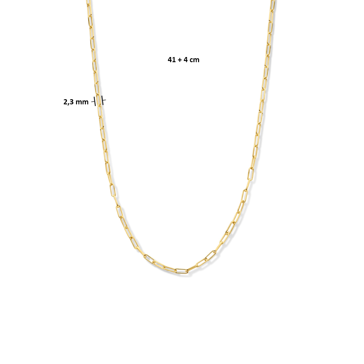 Geelgoud op 925 zilveren paperclip collier uitgevoerd met een karabijn sluiting. Het collier heeft een draaglengte van 41cm en een extensie van 4cm. Geen garantie op plating.
