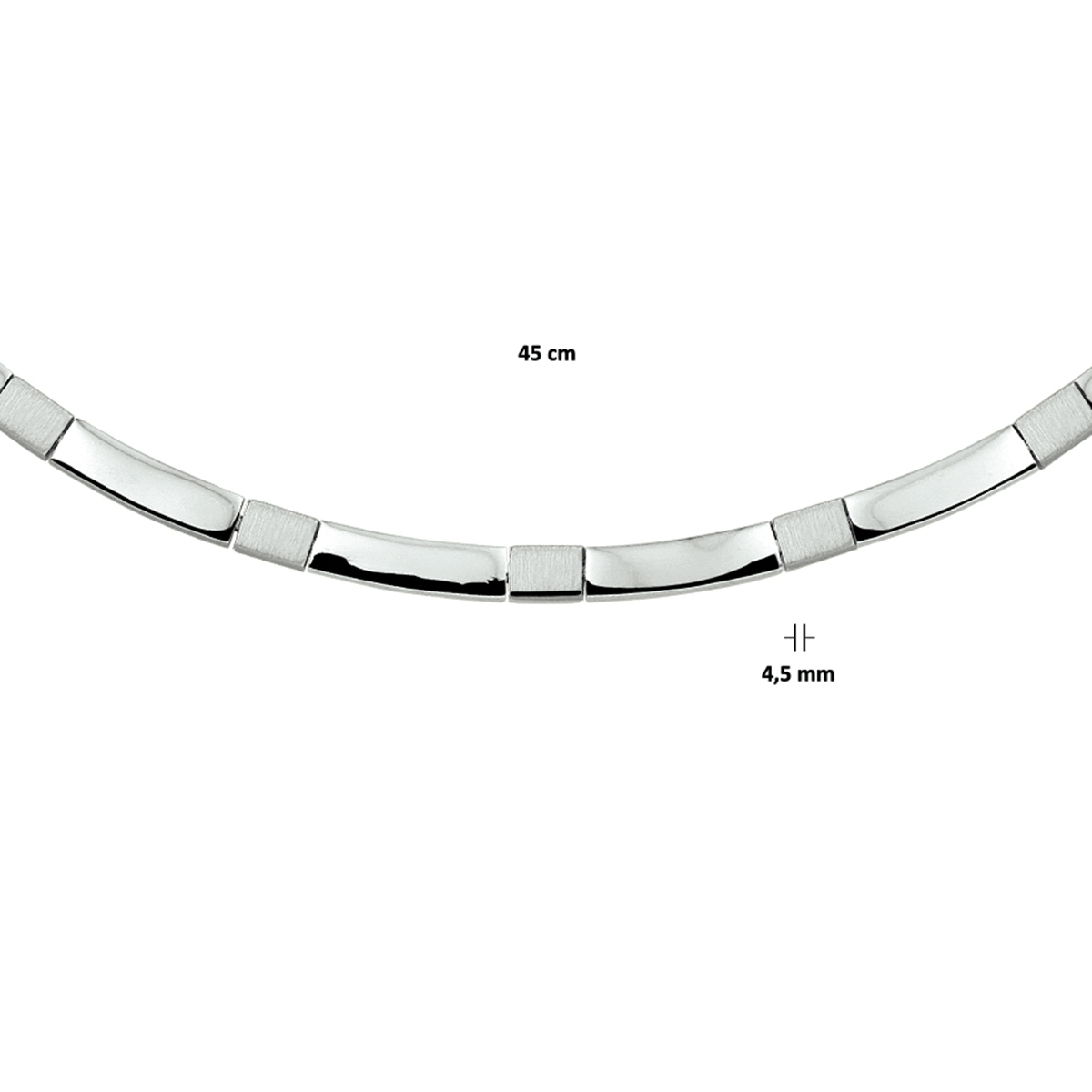 Gerhodineerd poli-mat zilveren 4.5mm breed collier uitgevoerd met een karabijn sluiting.