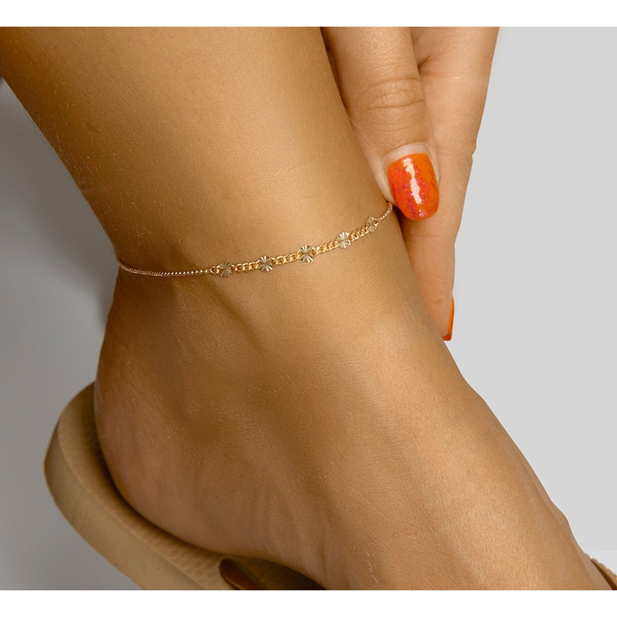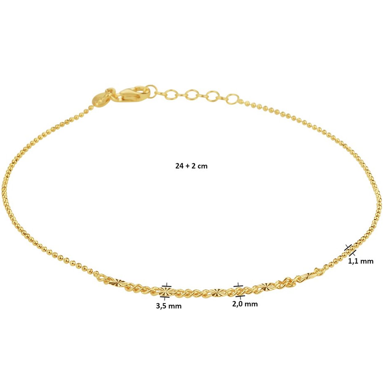 Geelgoud op 925 zilveren enkelbandje uitgevoerd met een stevige karabijn sluiting. Het enkelbandje heeft een draaglengte van 24cm met een extensie van 2cm.