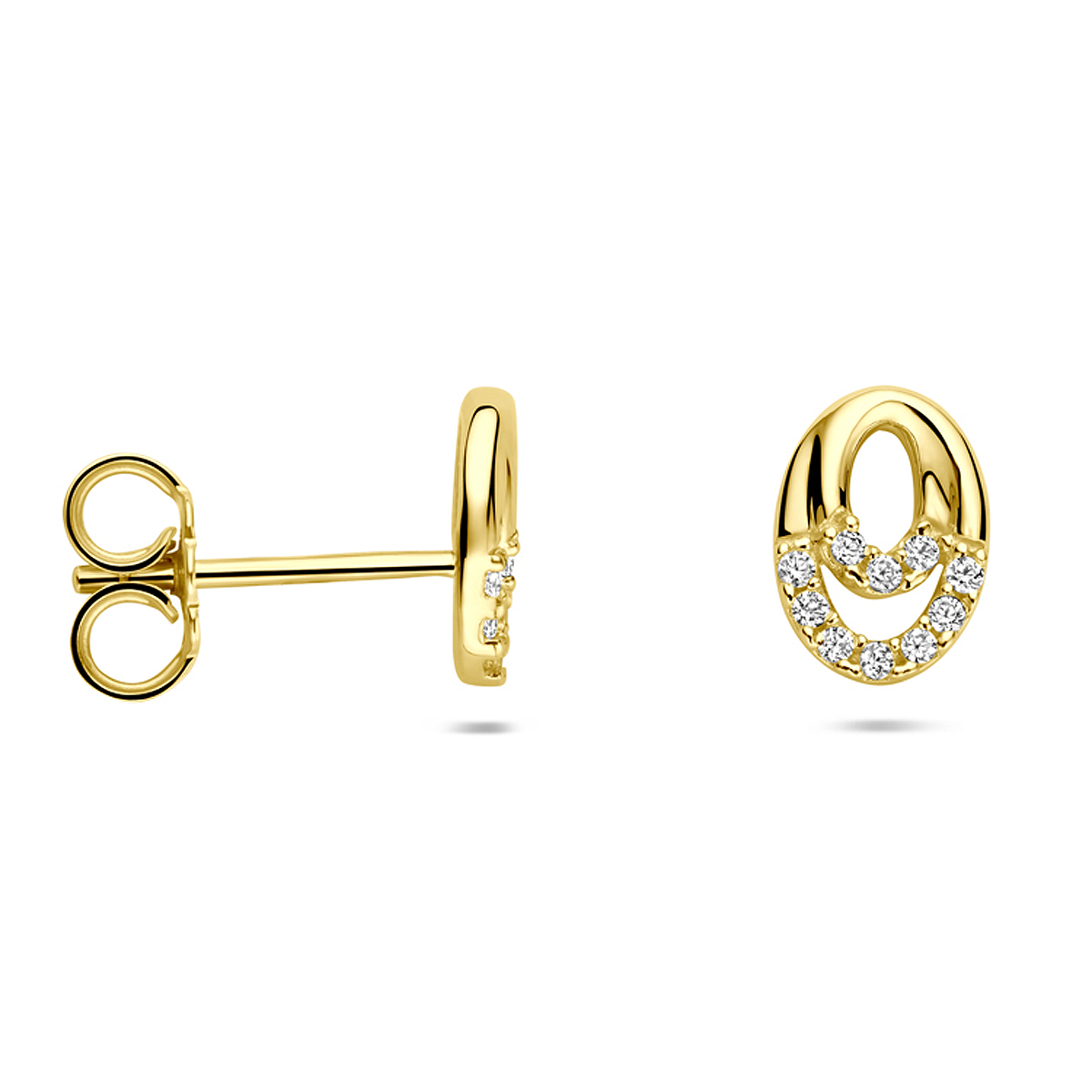 14k Geelgouden oorknoppen uitgevoerd met zirkonia. De oorknoppen hebben een afmeting van 8x6mm.