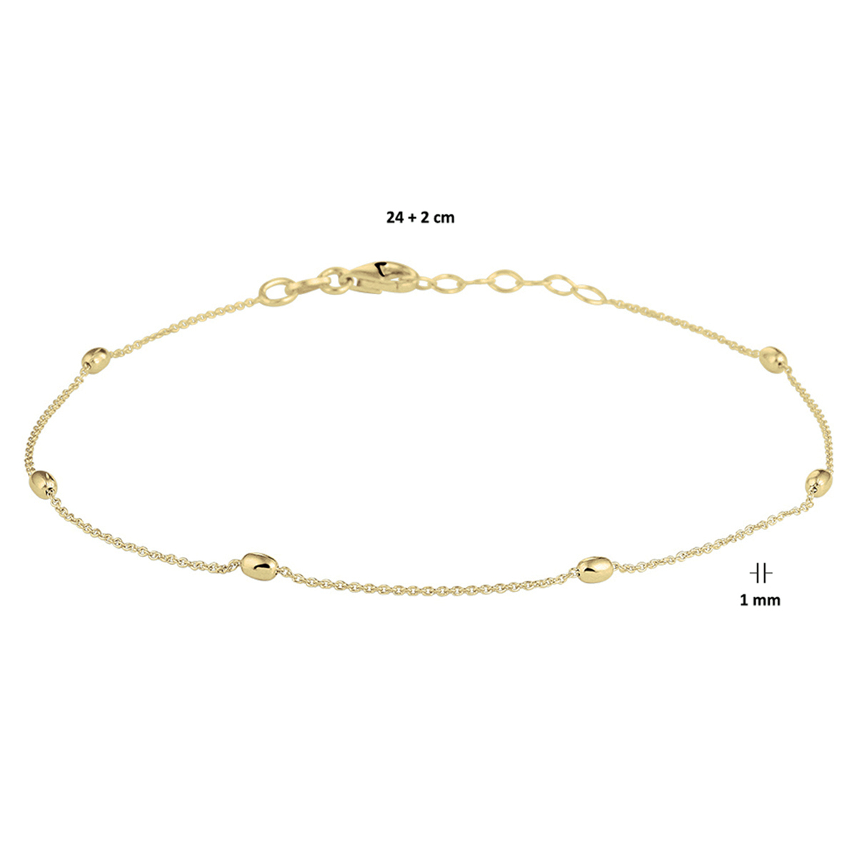 Trendy verguld op zilveren enkelbandje uitgevoerd met poli afgewerkte ovaal gevormde bolletjes met afmetingen van 2.5x3.6mm. Met een draaglengte van 24cm en een extensie van 2cm. Het enkelbandje heeft een karabijn sluiting. Tip: Leuk om kado te geven! De schakelbreedte is 1.0mm. Geen garantie op plating.