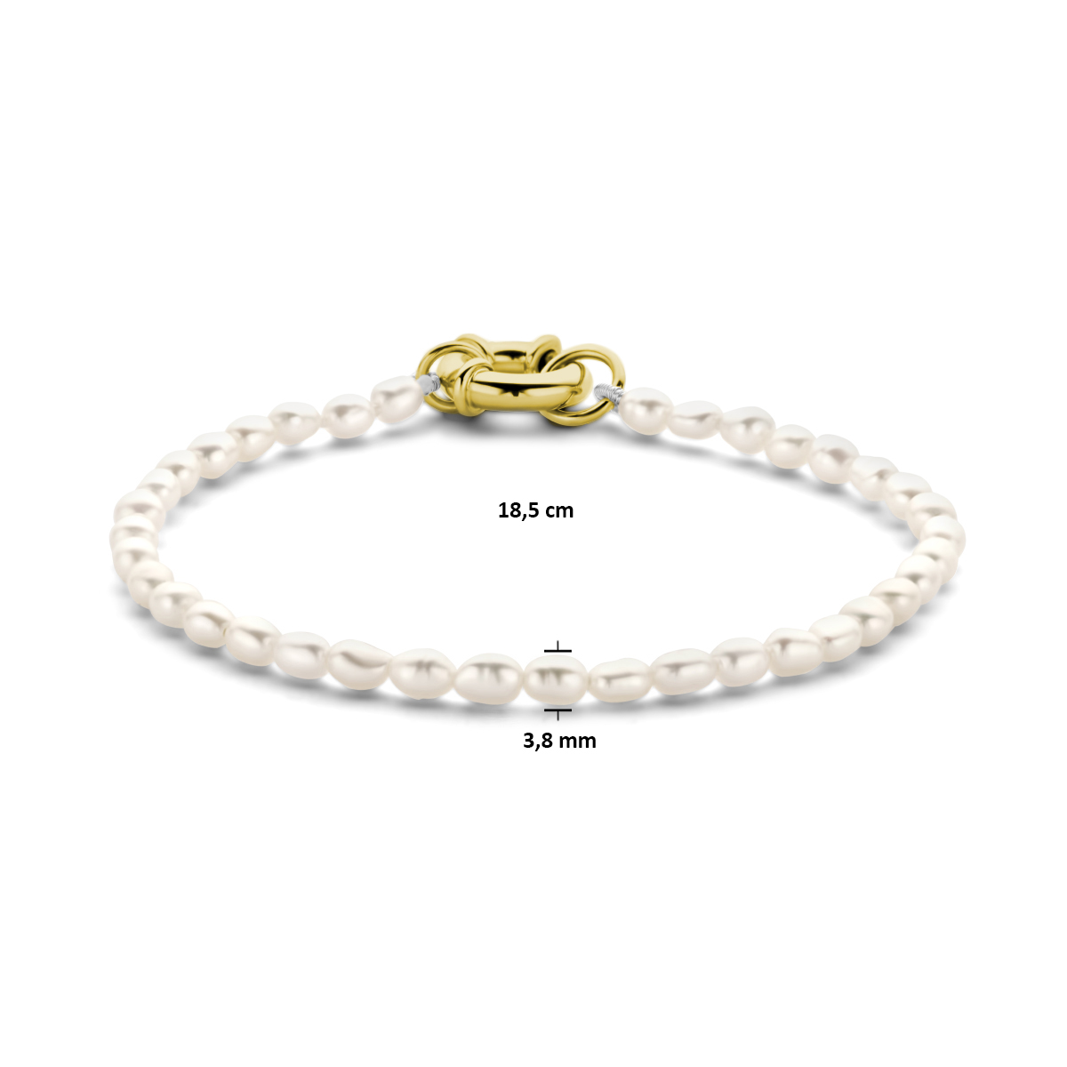 Verguld op 925 zilveren armband uitgevoerd met zoetwaterparels. De armband heeft een draaglengte van 18.5cm en een veerslot. De schakelbreedte is 3.8mm. Geen garantie op plating.
