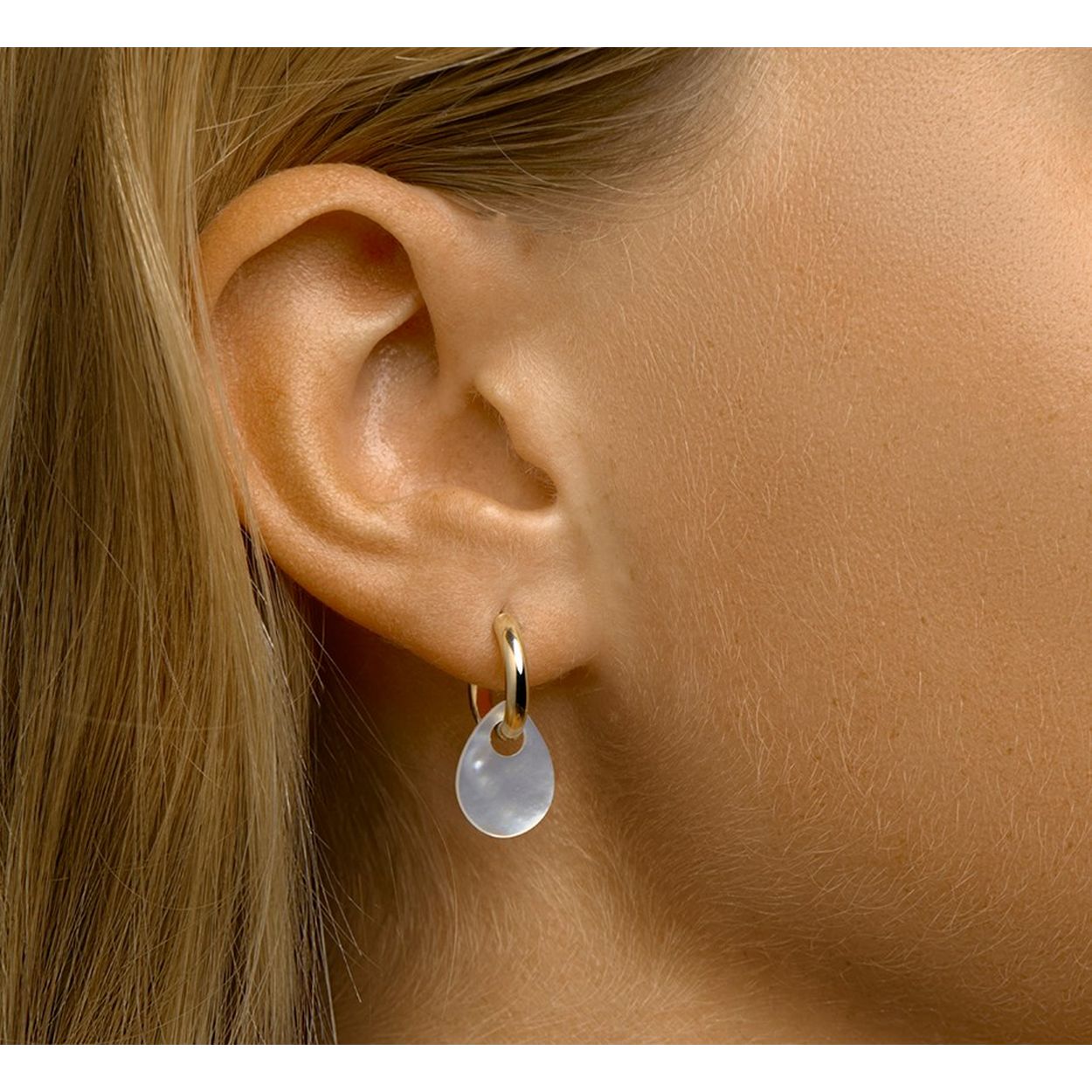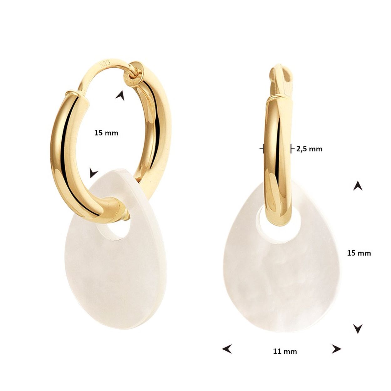 14k Geelgouden klapoorringen uitgevoerd met parelmoer. De oorringen hebben een dikte van 2.5mm en een diameter van 15mm. De hanger heeft een afmeting van 15x11mm.