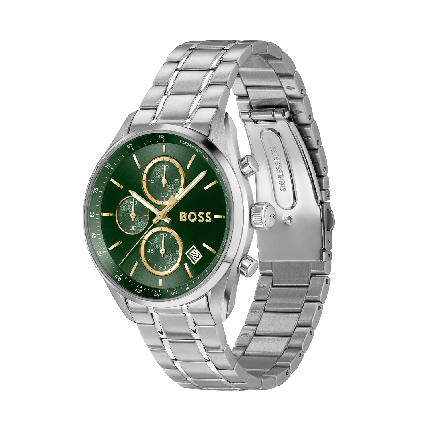 Dit BOSS horloge uit de GRAND PRIX 40 serie met artikelnr: HB1514265 heeft een sportieve uitstraling. Meer dan een horlogeaccessoire is dit horloge een symbool van sportieve luxe stijl en de sensatie van de tijd. Verrijk uw pols met een horloge dat de essentie van racen belichaamt, waar snelheid en verfijning samenkomen in een naadloze combinatie van vorm en functie. Dit herenhorloge valt op door zijn stalen horlogekast met een glanzende bezel en zijn groene sunray wijzerplaat met een chronograaf en een datum. Opvallend zijn de gepolijste wijzers, subeyes en uurstrepen. Aan de kast zit een stalen schakelband met vouwsluiting. Het horloge heeft een doorsnee van 40mm met een mineraalglas en is 5ATM.