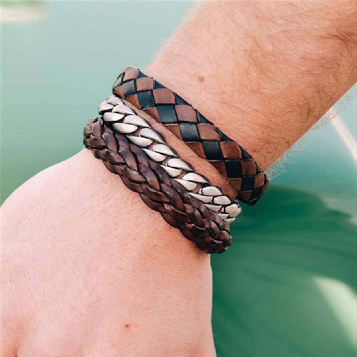 De iXXXi MEN armband Kay is een handgemaakte leren armband. De bracelet bestaat uit een dubbel gevlochten design bestaande uit brede, donkerbruin kleurige lederen banden. Armband Kay is voorzien van een langwerpige, mat zilverkleurige sluiting gemaakt van stainless steel.