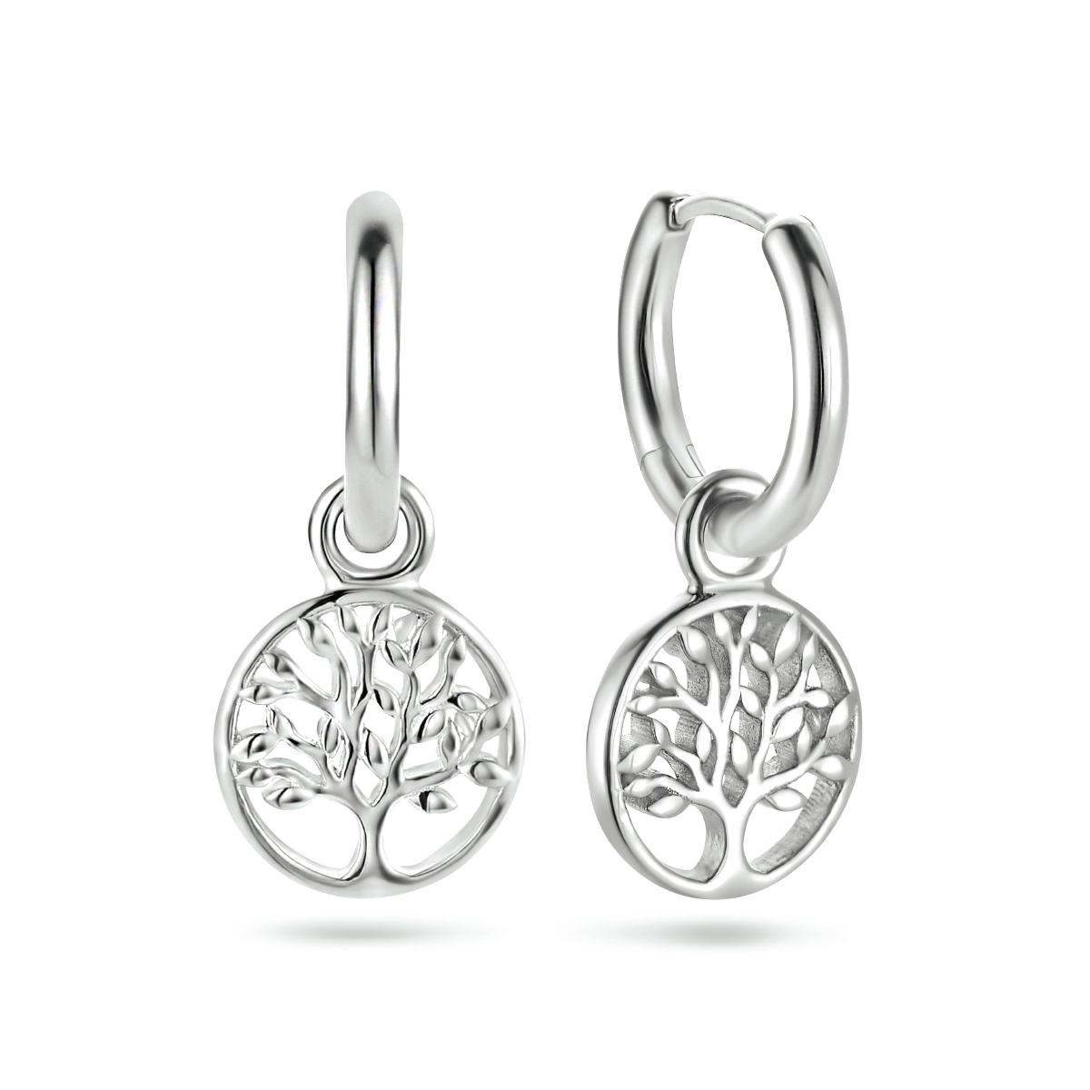 Gerhodineerd 925 zilveren klapoorringen met een levensboom. De levensboom hanger heeft een diameter van 9mm.