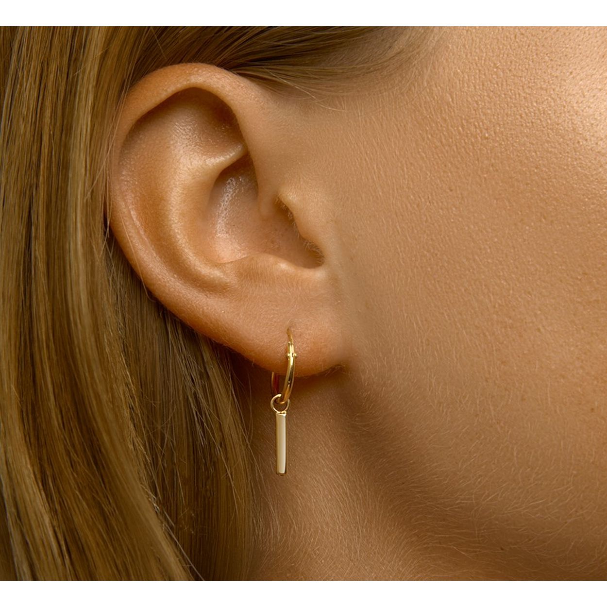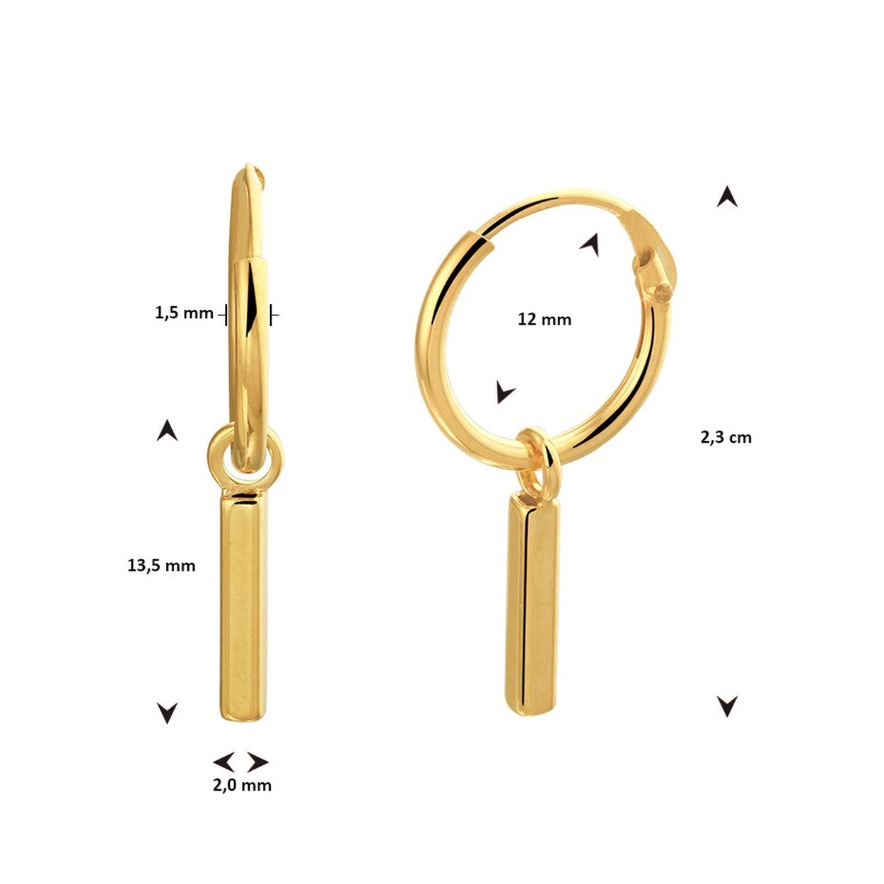 Geelgoud op 925 zilveren oorringen uitgevoerd met een hangertje in de vorm van een balkje. De oorringen hebben een diameter van 12mm en een dikte van 1.5mm. Het balkje heeft een afmeting van 13.5x2mm.