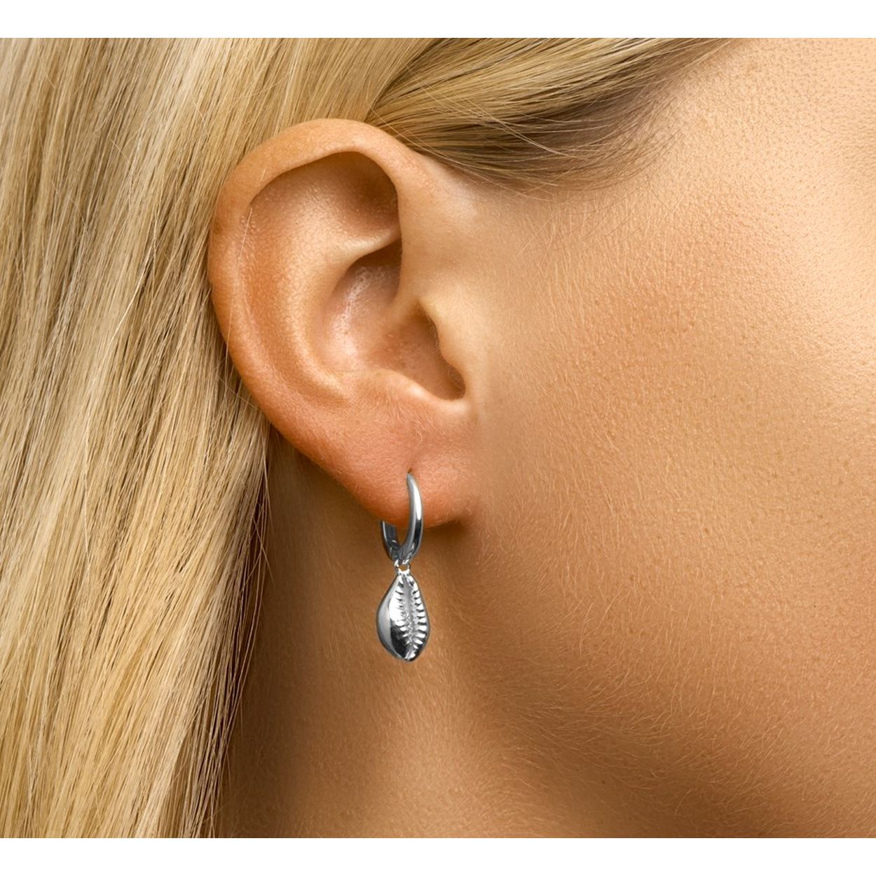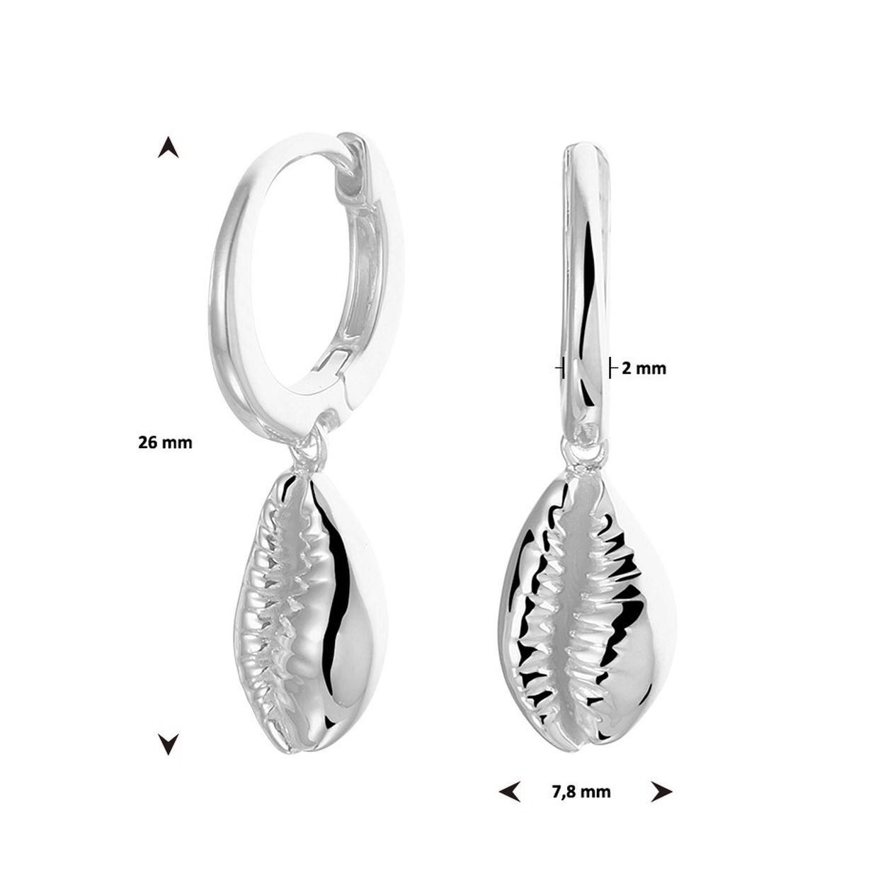 Gerhodineerd 925 zilveren oorringen uitgevoerd met een hanger in de vorm van een schelp. De oorhangers hebben een totale hoogte van 2.6cm en een breedte van 7.8mm.