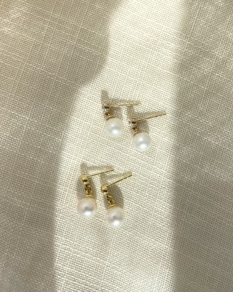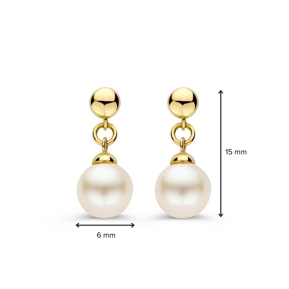 Stijlvolle geelgouden oorstekers met een rond element en een hangende parel.