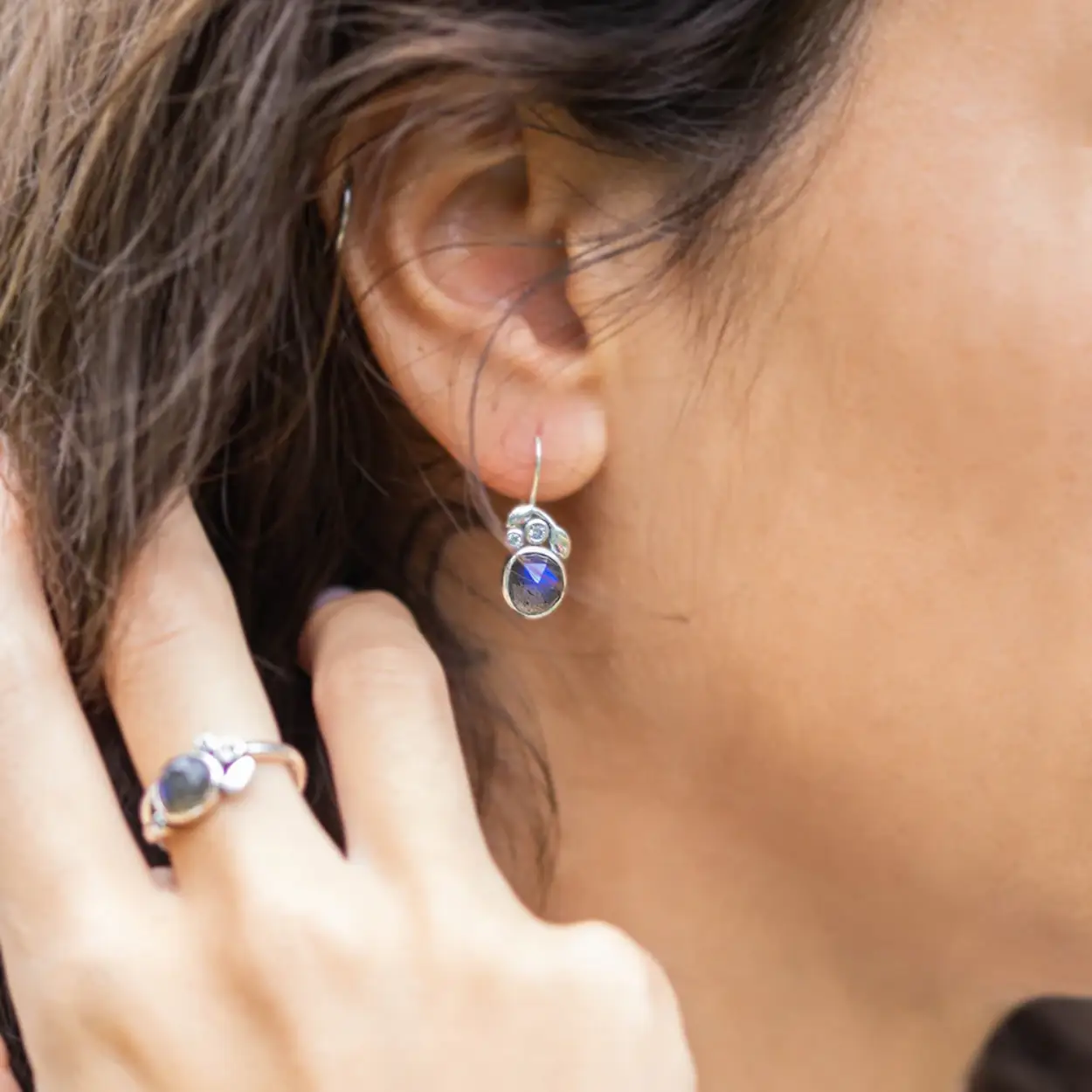 Rabinovich oorhangers Bliss. Deze sterling zilveren oorbellen hebben elk een 8 x 7 mm roosgeslepen labradoriet, een 1,5 mm zirkonia en een 2 mm zirkonia.
