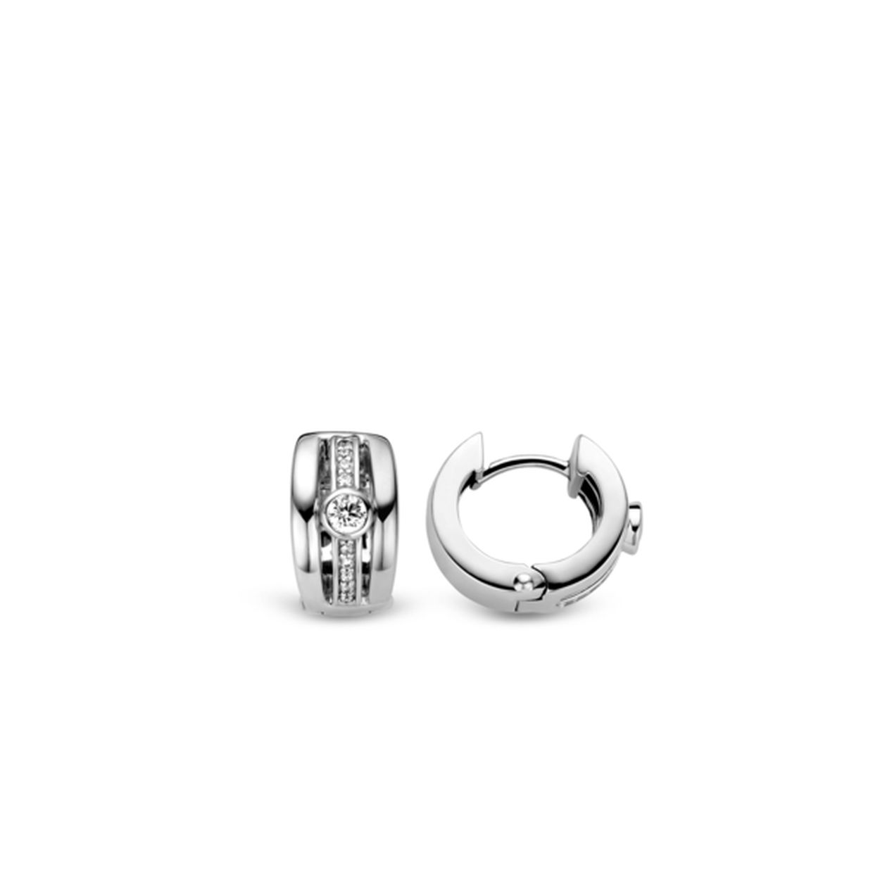 Deze TI SENTO - Milano oorbellen zijn een strak tijdloos ontwerp. De creolen bestaan van de voorzijde uit drie banden: de twee buitenste banden zijn glad gepolijst terwijl de middelste band gezet is met zirconia's. Tussen de verschillende banden is een kleine ruimte opengelaten waardoor het een luchtig ontwerp is. De oorbellen zijn gemaakt van gerhodineerd sterling zilver en hebben een diameter van 145mm. De rhodiumlaag zorgt voor een langdurige glans en bescherming. De oorbellen zijn goed te combineren met andere TI SENTO sieraden.