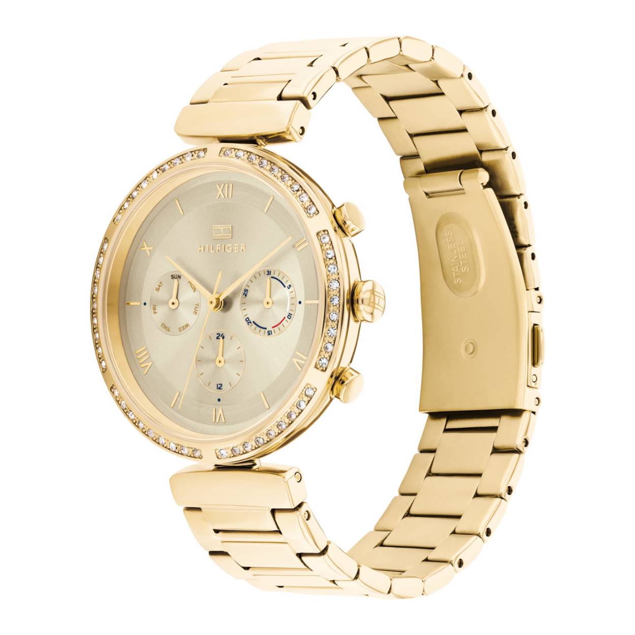 Dit horloge van Tommy Hilfiger uit de "Luna" collectie heeft een vergulde stalen band en kast met mat/glans afwerking. De wijzerplaat is goudkleurig met een dag, datum en 24-uurs aanduiding.