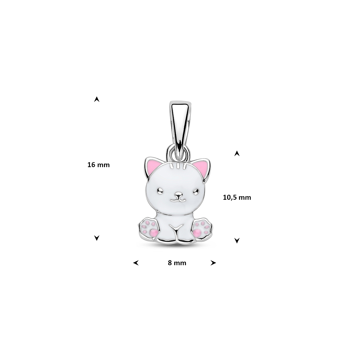 Gerhodineerd 925 zilveren hanger in de vorm van een poes met emaille. De hanger heeft een totale hoogte van 16mm.